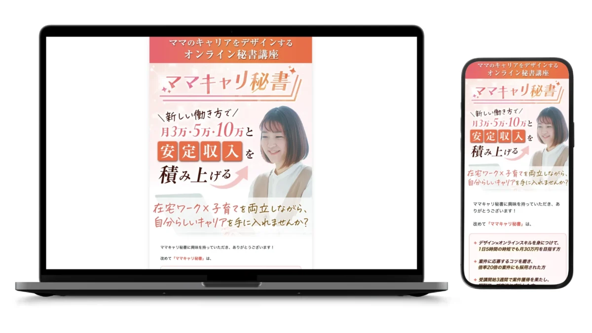 ランディングページ 【ママキャリ秘書様】オンライン秘書講座のファネルページ 事業者名いろはペン字書道教室地域東京都八王子市制作区分ランディングページジャンル趣味、実用、学び、スクール制作ツールPhotoshop 制作内容 オンライン秘書講座のファネルページ 制作時期 2025年5月 制作期間 5日 制作ポイント